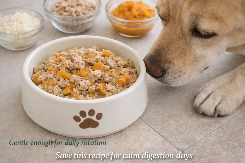 This recipe is designed to be part of a rotation rather than a permanent single-protein solution. Introduce gradually over several meals, especially if your dog is currently experiencing digestive sensitivity.