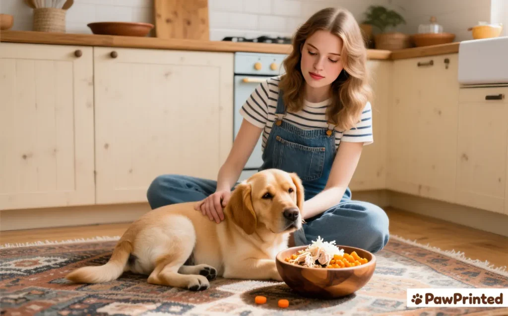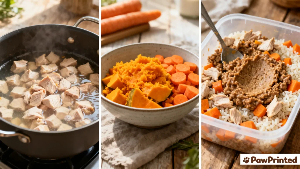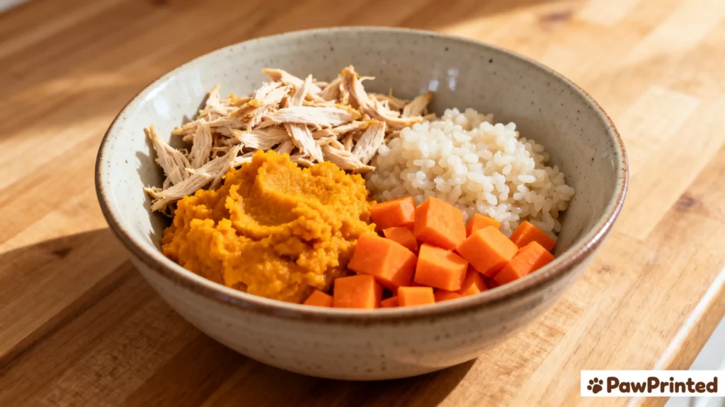 Vet-informed, gentle, and repeatable—this homemade chicken & pumpkin bowl keeps sensitive tummies calm and energy steady.